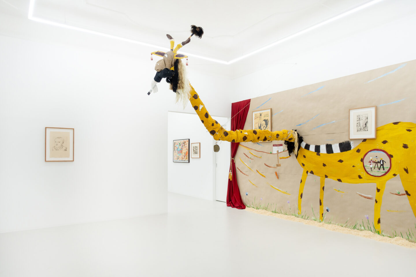 Aus der Wand wächst der Hals einer Giraffe – groteske Jagdtrophäe und Zentrum der Ausstellung. Käthe Kollwitz’ Giraffe ist kein harmloses Tier, sondern groß genug, um Max Beckmann und Andrew Gilbert zu verschlingen – so gefräßig, dass ihr Hals Stützen braucht.