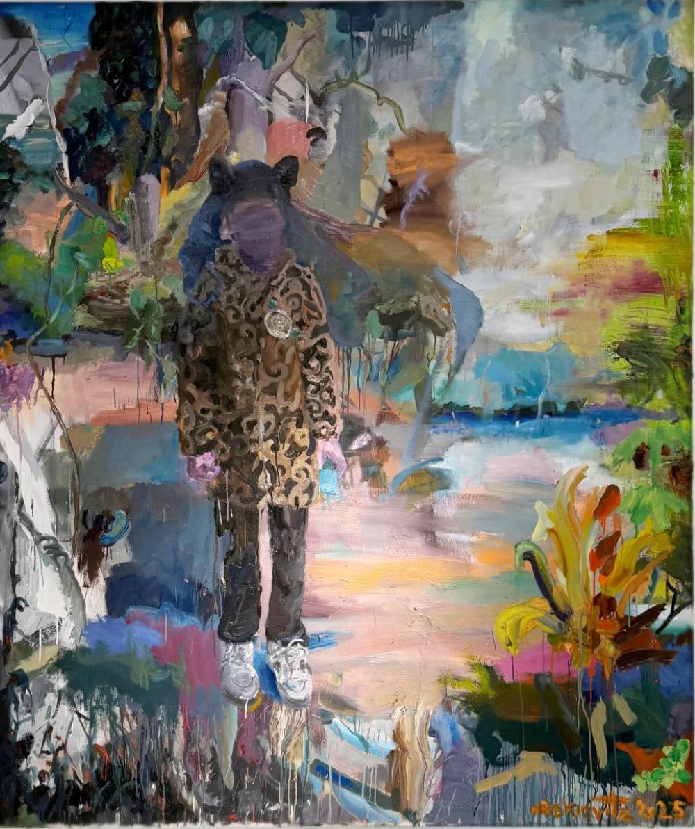 Die Landschaft scheint das zu wissen. Sie reagiert. Farben fließen, kippen, verdichten sich. Der Raum wird weich, als hätte er aufgehört, fest zu sein. Mensch, Tier und Umgebung verhandeln ihre Grenzen neu.