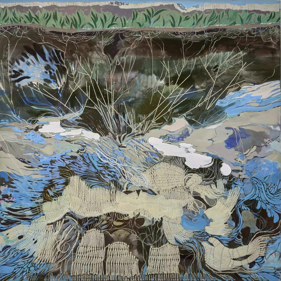 Die Komplexität der Komposition verstärkt sich noch durch eine Vielfalt an Materialien und Techniken. So verbindet Clasen nicht nur Malerei und Zeichnung, den flachen Stricht mit pastösem Farbauftrag, sondern ergänzt weitere Materialien, fügt Stoffapplikationen hinzu und entwirft digitale Collagen. Das Ergebnis sind stets feine, sensible und hochästhetische Kompositionen, die ihren Titeln wie Flut oder Wurzelwerk & Krone mehr als gerecht werden und doch jede Menge Raum für die eigene Deutung durch den Betrachter lassen.