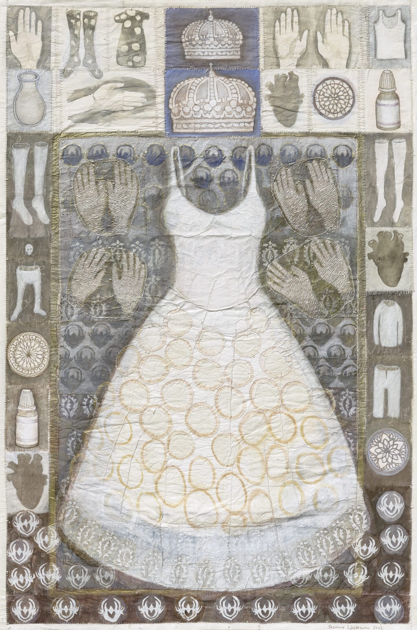 Susanne Waltermann, Großes Votivkleid, 2012, Schellack, Tusche, Acryltusche, Pigmente und Lackstift auf Seidenpapier und Japanpapier, durchnäht mit Baumwollgarn, 196 x 131 cm